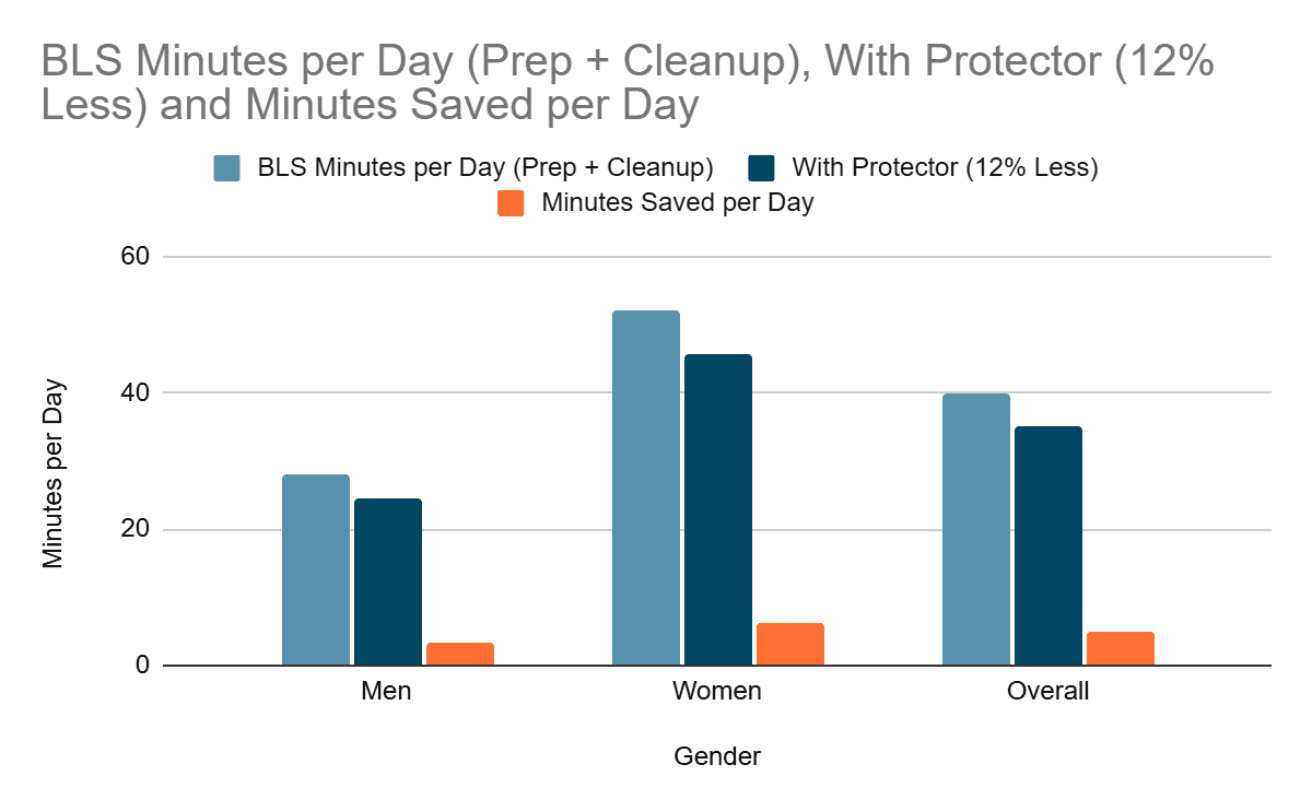 | Gender | BLS Minutes per Day (Prep + Cleanup) | With Protector (12% Less) | Minutes Saved per Day |